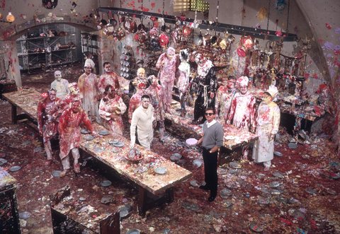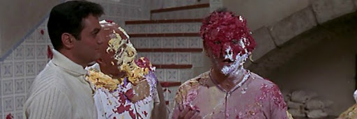 For me, there are many highlights I adore about this film. Jack Lemmon’s brilliant performance is foremost. His maniacal laughter and expressive responses crack me up every single time I’ve seen this. The multitude of costumes are visually stunning, especially for Natalie Wood’s Miss Dubois which were mostly in a flattering pink and absolutely gorgeous. The song, “The Sweetheart Tree” is a real lark because while it’s a lovely song that holds it’s own it also comes with a bouncing ball lyrics scroll along the bottom of the screen. I can’t help but enjoy the famous pie fight. It’s actually a record-holder as the largest pie fight in film history. They used 2,357 REAL pies of fruit, custard and whipped cream variety. In the midst of the pie-throwing chaos Lemmon’s Prince Hapnick shouts, “more brandy!” with his face covered in brandy-flavored pie and he gets smacked in the face with yet another. He then tastes the new pie smatterings from his face and announces: “Rum! I never mix my pies.” The best bit here is that while pies are constantly flying all over the room, Leslie stays untouched in his all-white outfit.