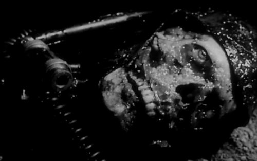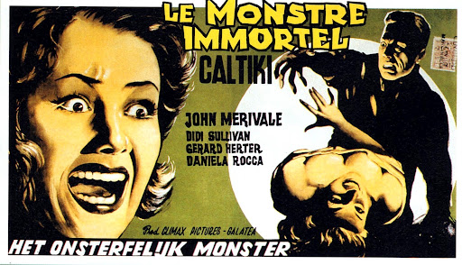 The second entry of the double feature was the Italian production, CALTIKI, THE IMMORTAL MONSTER. It shows Riccardo Freda as director but he claimed later that Mario Bava did most the directing after just a few days into production. The B cast ensemble includes John Merivale, Didi Sullivan, Gerard Herter, and Daniela Rocca. The plot centers around a group of archeologists exploring Mayan ruins who discover ancient Caltiki via pulsating, rapidly growing and flesh-eating blob monsters. In discovering Mayan gold and many skeletons in a hidden cave lake, one of the first victims is driven by greed for more yet narrowly escapes and becomes partially mutated then later turns into a killer driven by madness. As the blobs continue to mutant and grow, armies attack with fire blowers. The plot thickens as a comet reappears after a 1300 year absence which showers radiation to make the ancient flesh-eating blob turn into one enormous pile of goo destined for world domination. For it’s time and budget, there are some impressive special effects including underwater shots, authentic looking Mayan ruin sets, gory half-melted flesh shots and a film noir feel.