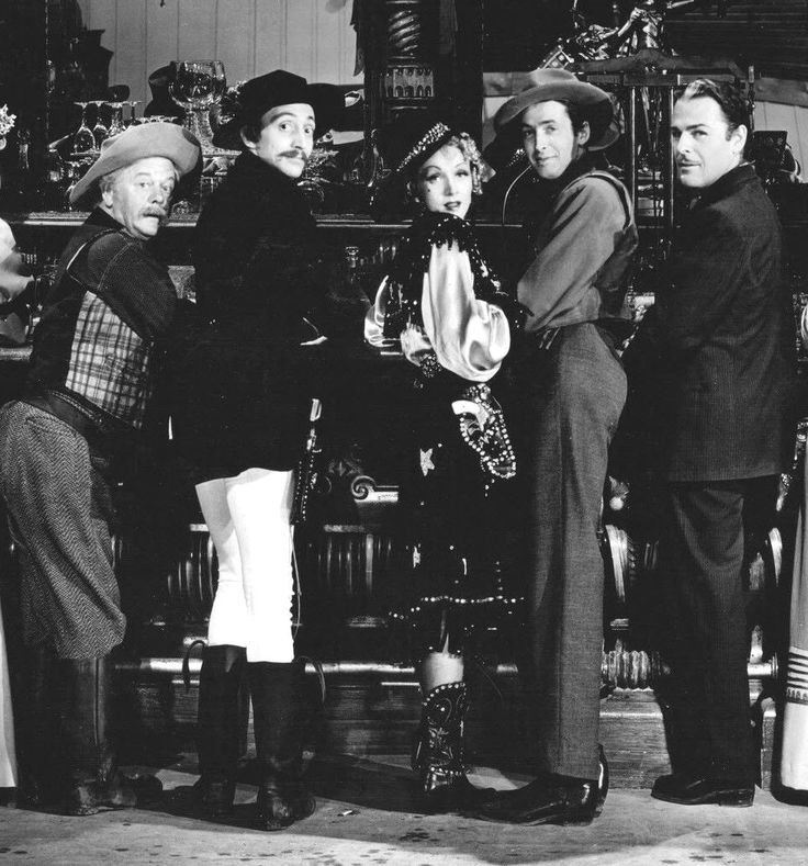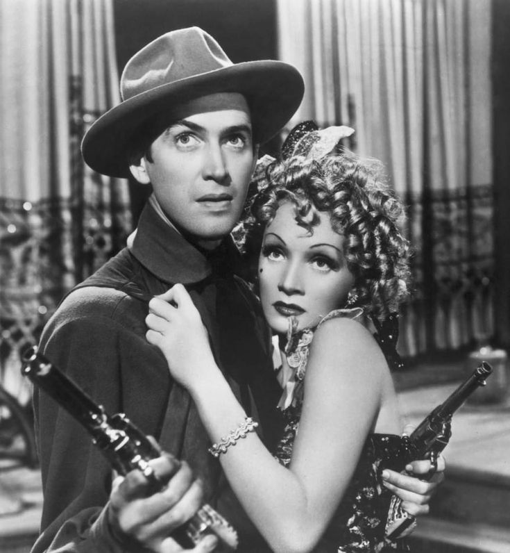 Stewart and Dietrich seemed an unlikely pair of misfits. Marlene’s screen image exuded glamour and exotic seduction in her many successful films of the 30s. But by later in that decade, her film career hit a rough patch. Jimmy’s on-screen persona of the slender and humble fella next-door was a rising upcomer from the world of light musicals and romantic comedies. He had only been in the biz a few years but was already making a strong impression. Universal took a gamble that this mismatched, unlikely pair could make it work in a typical western with an atypical twist. They were right. And this film helped to reinvigorate Dietrich’s film career and launched Stewart into stardom.
